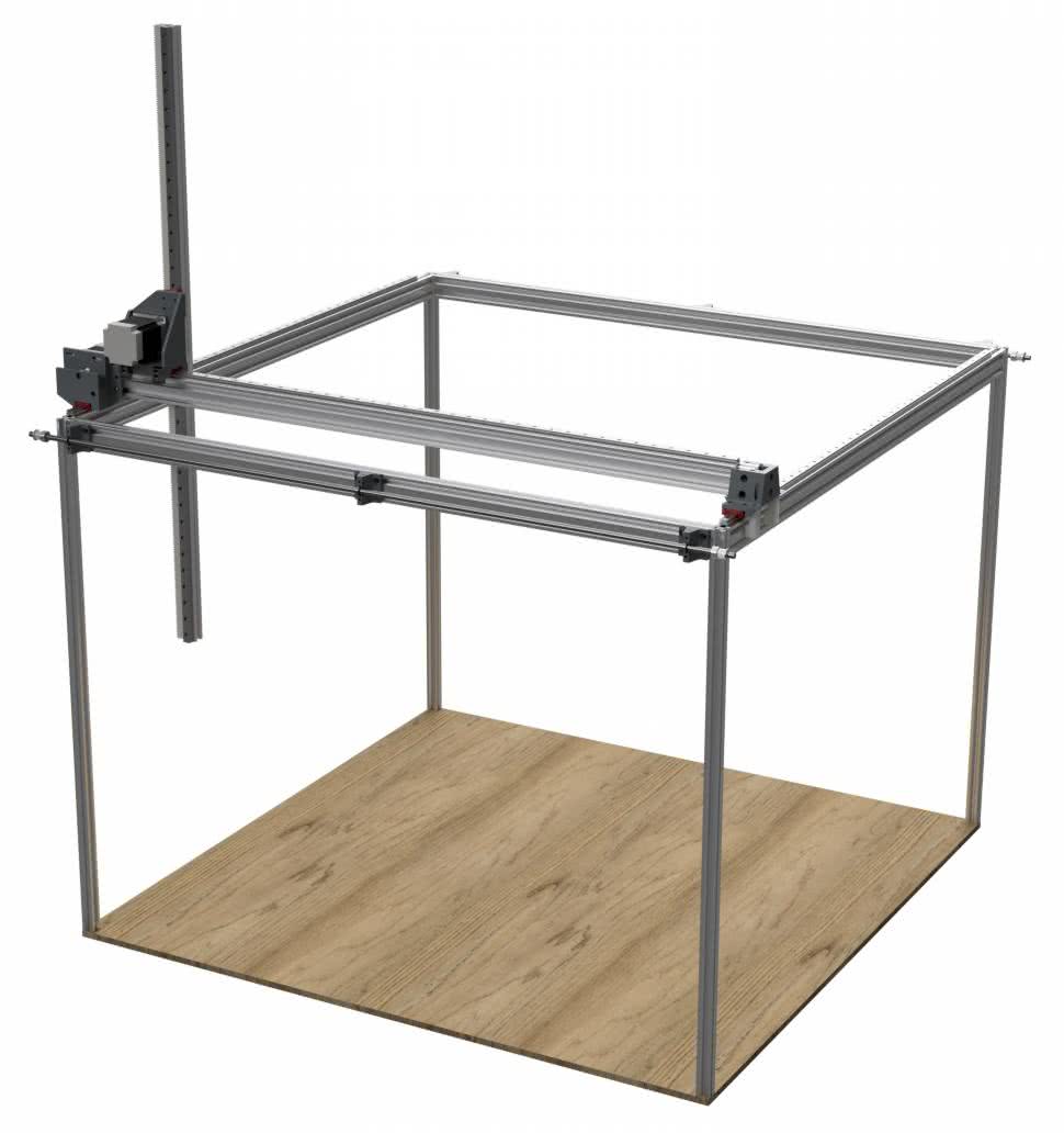 Prezentowany robot kartezjański bazuje na profilach aluminiowych V-slot 20×40 mm i 20×20 mm. Profile te charakteryzują się dużą wytrzymałością przy małej masie własnej. Wymiary robota to: 1040×1040×1114 mm (X, Y, Z). Aby zwiększyć sztywność konstrukcji, zastosowaliśmy małe zastrzały 200 mm, a od dołu umieściliśmy przezroczystą płytę z pleksi o grubości 4 mm. Robot ma możliwość poruszania się w trzech osiach i jest wyposażony w serwochwytak, który pozwala chwytać produkty i przenosić je z rolki na rolkę.