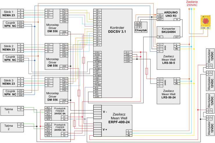 Zastosowanie dwóch niezależnych zasilaczy, zgodnie z instrukcją kontrolera DDCSV 3.1 wymagającą osobnego zasilania wejść i wyjść, zapewnia poprawne działanie logiki układu, a optoizolacja spełnia funkcję dodatkowej ochrony. Pierwszy zasilacz 24 V małej mocy odpowiada za zasilanie kontrolera oraz przekaźników, natomiast drugi, o tym samym napięciu, ale dużej mocy, odpowiada za zasilanie sterowników silników, taśm transportowych oraz wentylatorów (zastosowaliśmy wentylatory na napięcie 12 V).