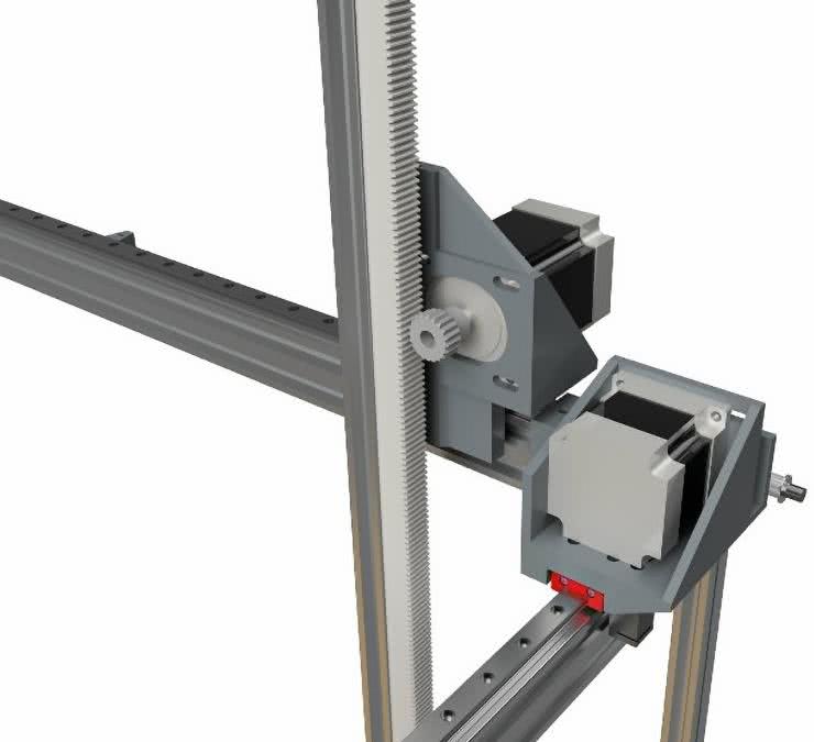 Oś Z została zbudowana w oparciu o koło zębate i listwę zębatą o module 1. Taki układ zamienia ruch obrotowy wału silnika na ruch posuwisto-zwrotny, dzięki któremu można podnosić przedmioty z rolek. Aby unieruchomić ten zespół, połączyliśmy opisywany moduł z prowadnicą liniową i wózkami liniowymi MGN12H – rysunek 3.