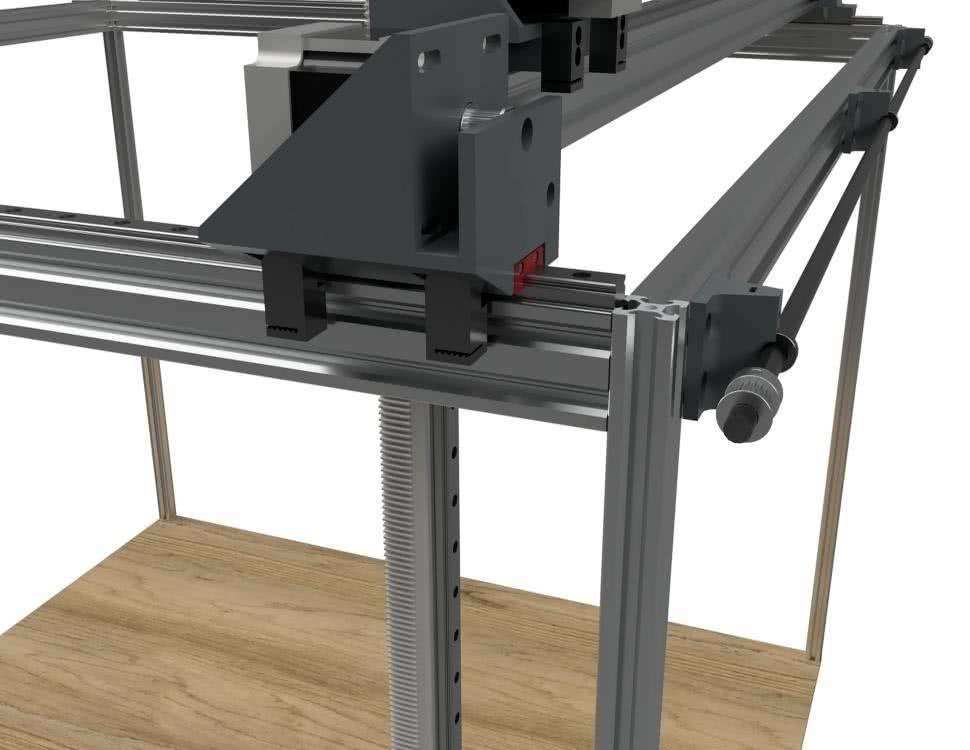 Ciekawie rozwiązana została oś Y, która napędzana jest za pomocą tylko jednego silnika krokowego w rozmiarze NEMA 23, napędzającego „nieskończony” pasek zębaty GT2. Z niego z kolei napęd jest przenoszony na wałek o średnicy 8 mm, umocownay na łożyskach kulkowych przytwierdzonych do ramy robota. Po dwóch końcach wałka zostały umieszczone zębatki GT2 T20 (20 zębów), które napędzają oś Y – aby umożliwić takie samo działanie po drugiej stronie robota, został tam zamontowany identyczny zespół, lecz już pozbawiony silnika. Część napędową osi Y pokazano na rysunku 2.