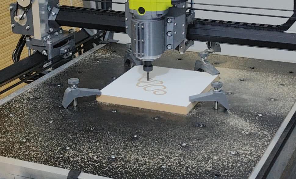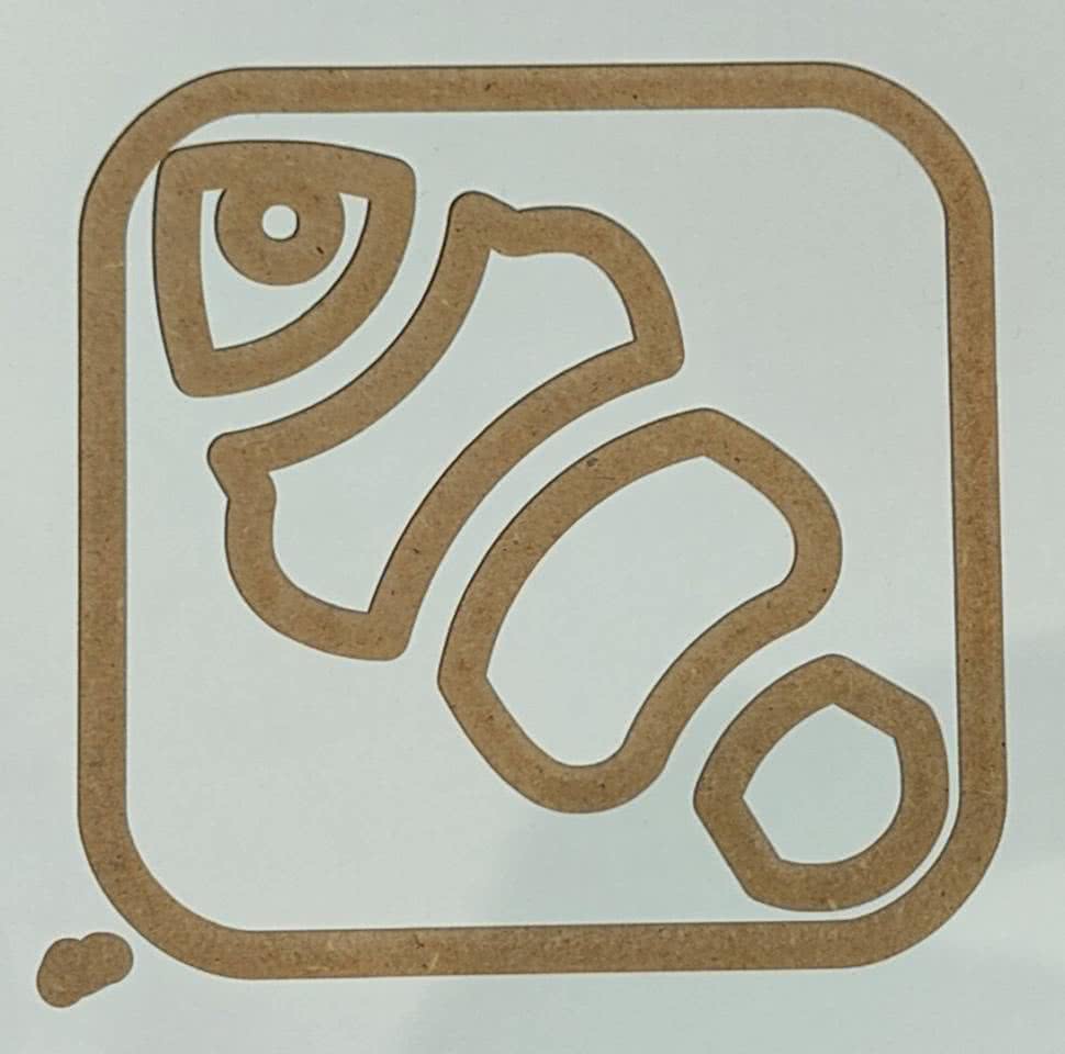 W celu przetestowania dokładności i jakości wykonania elementów przeprowadzono próbne frezowanie płyty MDF z logotypem projektu. Do obróbki użyto frezu prostego do drewna o średnicy 3 mm oraz płyty MDF o grubości 12 mm.