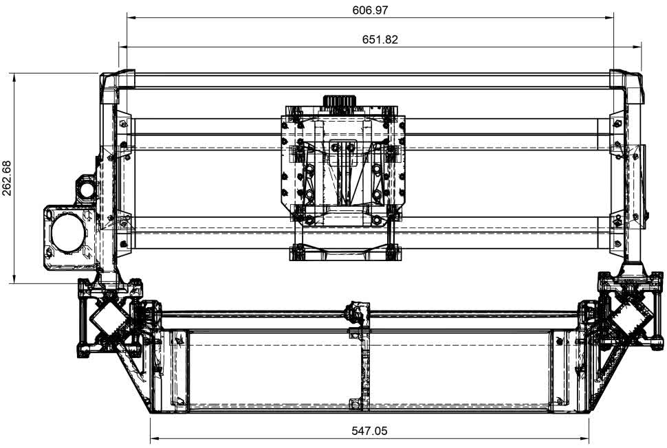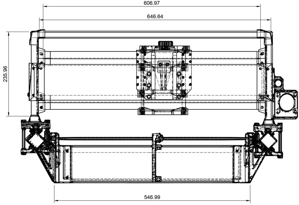 Podstawę urządzenia stanowi solidna rama spawana z profili stalowych zamkniętych 40×40×3 mm. Zastosowanie dodatkowych wsporników poprzecznych znacząco zwiększyło sztywność całości, minimalizując podatność na drgania podczas pracy oraz zapewniając stabilność nawet przy obróbce twardszych materiałów. Dzięki temu maszyna charakteryzuje się dobrą dokładnością i powtarzalnością w typowych zadaniach frezerskich.