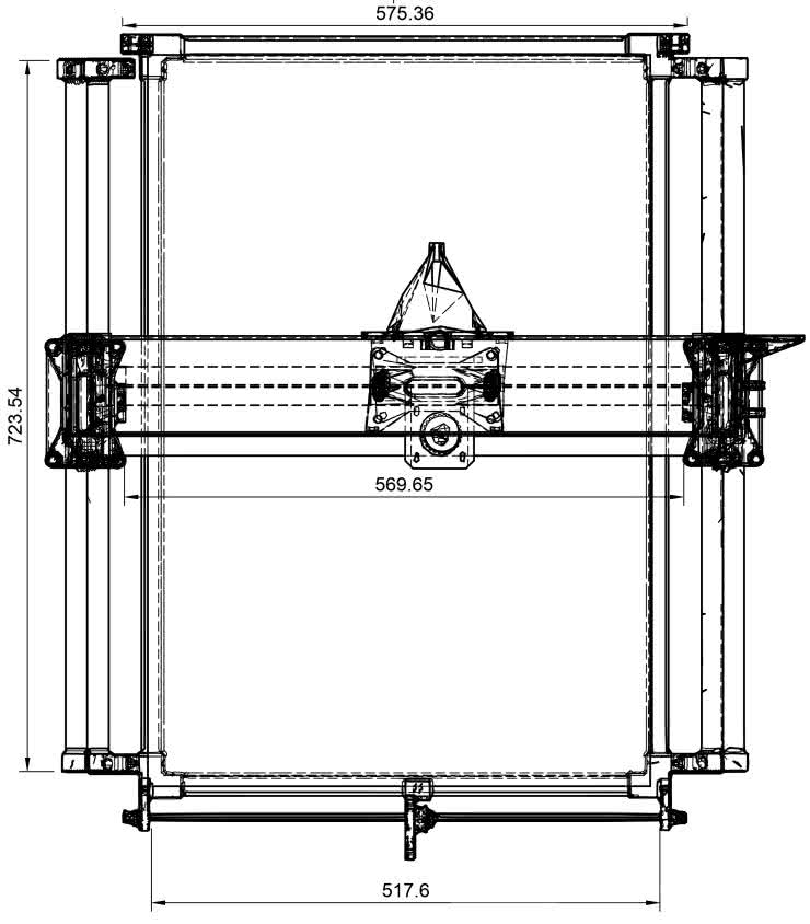 Pole robocze wynosi 604×754×75 mm, co przy gabarytach całkowitych 950×800× 650 mm czyni urządzenie kompaktowym i łatwym w adaptacji do pracowni warsztatowych czy przestrzeni edukacyjnych. Stół roboczy wykonano z płyty MDF o grubości 18 mm, przykręconej do ramy śrubami M8. W celu ułatwienia mocowania materiałów wprowadzono raster otworów co 50 mm, umożliwiający stosowanie uniwersalnych uchwytów mocujących oraz szybkie przezbrajanie stanowiska.