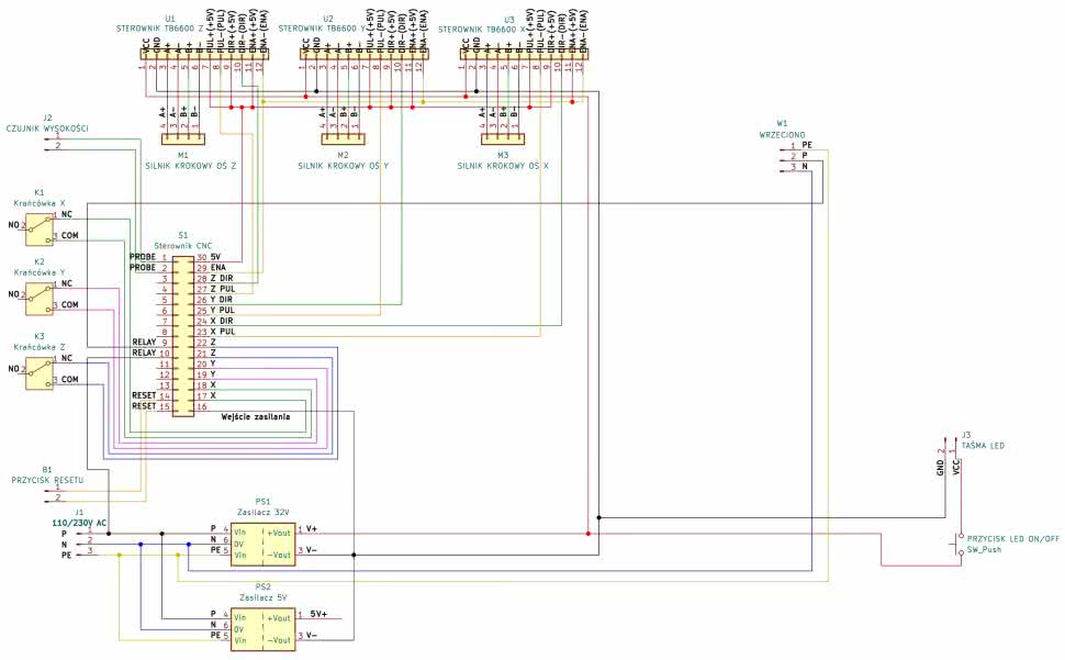 Układ sterowania obrabiarki został oparty na nowoczesnej płytce głównej GRBL 32-bit V2.0 z mikrokontrolerem ESP32, która łączy w sobie prostotę popularnego standardu GRBL z wysoką mocą obliczeniową oraz bogatymi możliwościami komunikacyjnymi. Zastosowany mikrokontroler ESP32, pracujący z zegarem 240 MHz, pozwala na płynną realizację interpolacji ruchów oraz szybkie przetwarzanie kodów G, a dodatkowo umożliwia obsługę połączeń bezprzewodowych w standardzie Wi-Fi i Bluetooth, co otwiera drogę do zdalnego przesyłania programów, aktualizacji oprogramowania oraz bieżącej diagnostyki pracy maszyny. Płytka wyposażona została również w złącze RJ45, które pozwala na przewodową komunikację z siecią lokalną lub podłączenie zewnętrznego panelu operatorskiego. W praktyce sterownik obsługuje cztery osie, co daje możliwość dalszej rozbudowy urządzenia o oś obrotową bądź dodatkowe moduły narzędziowe. Sterowanie odbywa się w pełni autonomicznie z poziomu kolorowego ekranu dotykowego TFT o przekątnej 3,2 cala, który umożliwia konfigurację parametrów pracy, definiowanie makroprzycisków, a także sterowanie wrzecionem. Napęd osi realizowany jest przez silniki krokowe NEMA 23 współpracujące ze sterownikami TB6600, które pozwalają na regulację prądu w zakresie od 0,5 do 3,5 A, obsługują mikrokroki do wartości 1/32, a także wprowadzają izolację optyczną (chroniącą układ logiczny przed zakłóceniami) oraz zabezpieczenia termiczne. Cały system zasilany jest z jednego zasilacza impulsowego 24 V o wydajności prądowej 15 A, co zapewnia wystarczającą rezerwę mocy do jednoczesnej pracy wszystkich osi i wrzeciona. Zasilacz został umieszczony w wentylowanej kasecie pod stołem roboczym, wraz z kompletną elektroniką sterującą, co pozwoliło obniżyć całkowitą wysokość konstrukcji, poprawić ergonomię obsługi oraz ułatwić dostęp serwisowy. Dodatkowo wszystkie moduły zostały zamontowane na specjalnie zaprojektowanych i wydrukowanych w technologii 3D uchwytach, a prowadzenie przewodów zrealizowano za pomocą dedykowanych kanałów i przelotek, również wykonanych metodą FDM, dzięki czemu rozmieszczenie komponentów jest uporządkowane i optymalnie dopasowane do przestrzeni roboczej. Zadbano również o bezpieczeństwo – zastosowano krańcówki na każdej osi, a całość uzupełniono o układ awaryjnego zatrzymania typu „grzybek”, który w razie potrzeby natychmiast odcina zasilanie silników i wrzeciona. Na rysunku 7 pokazano kompletny schemat elektryczny obrabiarki, obejmujący połączenia płytki GRBL ESP32, sterowników TB6600, krańcówek oraz wrzeciona.