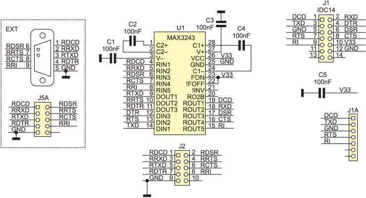 RS232 Modem to moduł udostępniający wszystkie sygnały portu RS232 przydatne podczas współpracy z modemami lub urządzeniami wymagającymi sprzętowego sterowania/potwierdzenia transmisji. Schemat modułu RS232 Modem przedstawia rysunek 2. Do konwersji sygnałów z 3,3 V doprowadzonych do modułu przez złącze J1 na poziom zgodny z RS232 jest używany łatwo dostępny driver U1 typu MAX3242 w swojej typowej aplikacji.