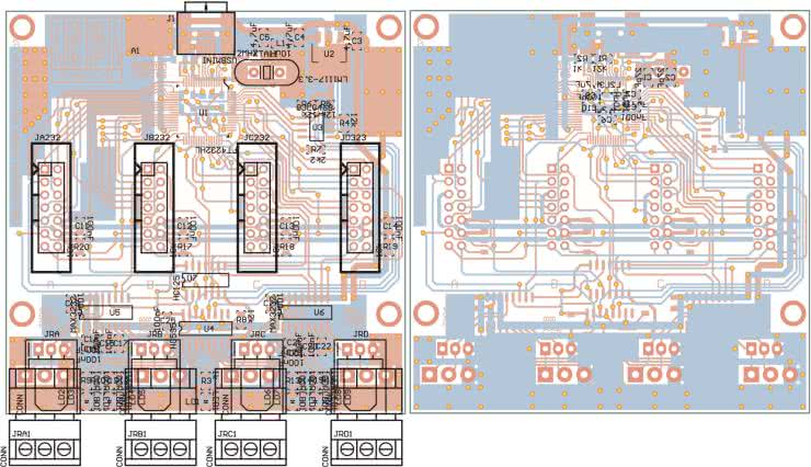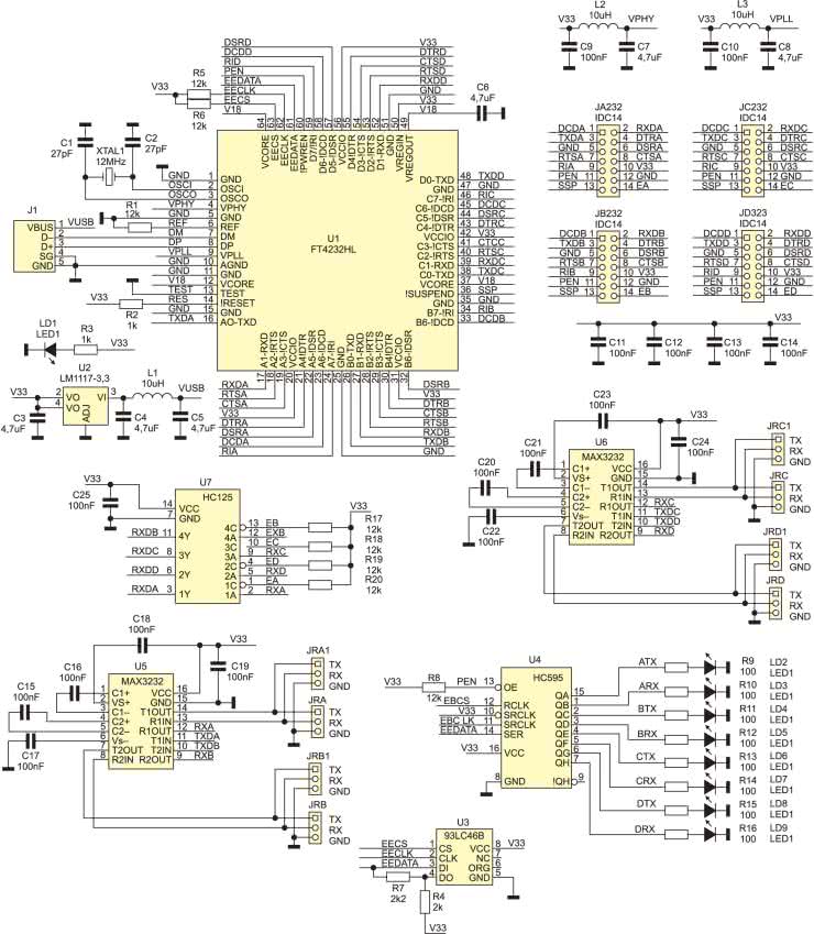 Schemat jest typowy. Układ U1 jest zasilany ze złącza USB, stabilizator U2 (LM1117) dostarcza napięcia 3,3 V do zasilania wszystkich elementów układu. Pamięć EEPROM U3 (93LC46B) przechowuje nastawy konfiguracyjne układu U1, rejestr U4 (74HC595) odpowiada za sygnalizację aktywności każdego z portów COM. Dioda LD1 sygnalizuje załączenie zasilania modułu. Tutaj kończy się typowa aplikacja FT4232. Ze względów praktycznych na płytce umieszczono drivery RS232 U5 i U6 typu MAX3232. Sygnały interfejsu RS232 ograniczono tylko do RXD/TXD, gdyż takie uproszczone interfejsy są stosowane najczęściej. Sygnały RS232 są dostępne na złączach JRxx.