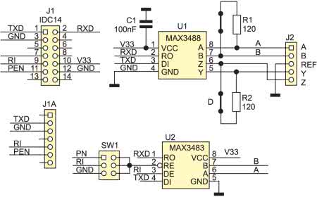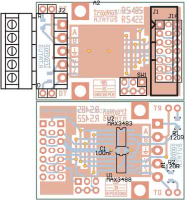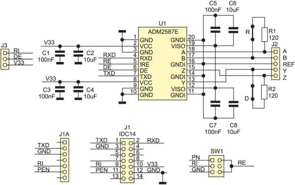 Moduł jest oparty o specjalizowany układ U1 typu ADM2587E. Realizuje on kompleksowo problem separacji galwanicznej mas. Oprócz wbudowanego drivera RS422/485 ma wbudowaną przetwornicę z separacją, nie wymaga więc żadnych trudnodostępnych elementów indukcyjnych lub zewnętrznych przetwornic z separacją. Wymienione cechy i prostota rozwiązania rekompensują całkowicie cenę układu. Sygnały wyjściowe RS422/485 są doprowadzone do złącza J2. Podobnie jak w wypadku wcześniej opisanego modułu, istnieje możliwość skonfigurowania trybu pracy. Złącze SW1 pełni identyczną funkcję jak wcześniej sterując pracą odbiornika. Złącze J3 steruje pracą nadajnika. Zwarcie sygnałów RI/DE układu U1 przy pracy w trybie RS485 przełącza U1 z trybu nadawania na odbiór sygnałem sterującym RI. Umożliwiając to realizację transmisji w trybie półdupleksu. Zwarcie sygnałów DE z V33 w trybie RS422 uaktywnia nadajnik. Przy realizacji magistrali RS485 należy pamiętać o konieczności mostkowania sygnałów AY i BZ złącza J2 oraz o zastosowaniu terminatorów dołączonych do magistrali.