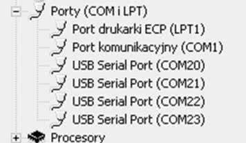 W wypadku pracy pod kontrolą systemu Windows, po podłączeniu do komputera automatycznie są instalowane odpowiednie sterowniki, a moduł po poprawnej instalacji jest widoczny w Menedżerze Urządzeń jako cztery niezależne porty COM (rysunek 9). W przypadku innego system lub problemów z instalacją, drivery VCP są dostępne na stronie firmy FTDI pod adresem http://www.ftdichip.com/Drivers/VCP.htm.