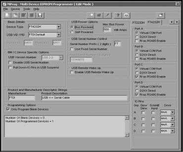W celu skonfigurowania układu FT4232, wyboru typu i sposobu sterowania modułami rozszerzeń, konieczne jest pobranie aplikacji FT_PROG lub w zależności od systemu, starszej MPROG (rysunek 10). Po uruchomieniu aplikacji z zakładek wybieramy układ FT4232H i ustawiamy wymagane opcje, rozpoczynając od zwiększenia maksymalnego prądu pobieranego z USB do 500 mA (wystarczająco dla jednego modułu z separacją i trzech dowolnych pozostałych), ustawienia driverów VCP, ewentualnego wyboru sposobu sterowania dla modułów RS485 oraz ustawienia minimalnej obciążalności portów COM.