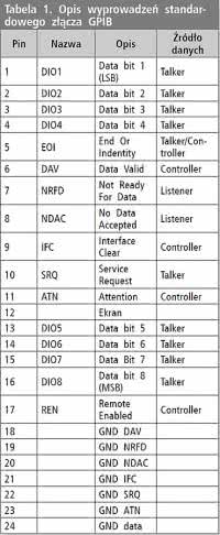 Od strony elektrycznej magistrala GPIB to 8 bitów danych, 3 linie do kontroli przepływu danych oraz 5 linii do zarządzania magistralą. Wszystkie poziomy napięć są zgodne z TTL. Typowym złączem jest 24-pinowy wtyk podobny do złącza Centronics używanego w drukarkach. W tabeli 1 umieszczono listę wyprowadzeń złącza używanego przez IEEE488. Z opisem magistrali HPIB można zapoznać się w dokumencie [1].