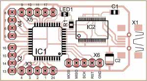 Konwerter zmontowano z użyciem elementów SMD na płytce jednostronnej (rysunek 2). Jego konstrukcja jest jednak tak mało skomplikowana, że można go z z powodzeniem zmontować na płytce uniwersalnej używając mikrokontrolera w obudowie DIP-40. Należy przy tym pamiętać o innym rozmieszczeniu wyprowadzeń, niż w wersji w obudowie TQFP44. Jako konwerter RS232/USB można zastosować jakąkolwiek płytkę z układem FT232, PL2303 lub podobnym. Ponieważ sygnał zegarowy dla mikrokontrolera jest pobierany z FT232RL, montując układ na płytce uniwersalnej można dołączyć do mikrokontrolera kwarc 12 MHz oraz dwa kondensatory 22...27 pF. Stosując zewnętrzny kwarc należy pamiętać o odpowiedniej zmianie fusebits w mikrokontrolerze. Montaż układu z racji małej ilości elementów jest prosty. Należy go wykonać zgodnie z rys. 2.