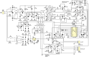 Napięcie sieciowe 230 VAC jest doprowadzone bezpośrednio na złącze CON1. Następnie przez rezystor R20 i bezpiecznik F1 trafia na filtr złożony z kondensatorów C15 i C17 oraz dławika DŁ1, a potem jest doprowadzone do mostka prostowniczego. Równolegle napięcie sieci jest dołączone przez rezystor R22 i bezpiecznik F2 do transformatora Tr4. Po wyprostowaniu napięcia z uzwojenia wtórnego jest filtrowane za pomocą kondensatora C21, stabilizowane przez U2 i wyprowadzone na złącze CON3. Napięcie występujące na kondensatorze C2 służy do zasilania sterownika zasilacza i transformatora separującego Tr2. Rezystor R20 ogranicza skutki udaru prądowego podczas ładowania pojemności kondensatorów C1 i C2. Rezystory R1 i R2 umożliwiają równomierny rozkład napięcia na kondensatorach C1 i C2 oraz rozładowują je po wyjęciu wtyczki z gniazda sieciowego. Diody D1 i D2 zabezpieczają tranzystory kluczujące przed przepływem prądu wstecznego. Diody są typu FR107 - należy zwrócić uwagę, że są to diody szybkie i nie można ich zastąpić diodami prostowniczymi np. typu 1N4007.