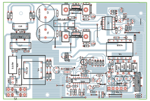 Schemat montażowy płyty głównej pokazano na rysunku 14. Cała płyta główna została zmontowana na płytce jednostronnej o wymiarach 200,9 mm×204,8 mm. Ze względu na to, że układ jest dość skomplikowany nie dało się uniknąć zworek. Większość otworów mocujących została dostosowana do obudowy, tylko pod otwór oznaczony literką "X" należy wykonać otwór w dnie obudowy we własnym zakresie. Punkty lutownicze oznaczone literą "Y" łączymy cienkim przewodem. To samo robimy z punktami "Z". Należy zwrócić uwagę na sposób prowadzenia ścieżek masy GNDPWR - jest on dość specyficzny, ponieważ stanowi obwód zasilania wzmacniacza mocy. Takie prowadzenie masy spowoduje, że wzmacniacze mocy nie będą się wzbudzały. Ścieżki zasilania +25V i -25V oraz ścieżki z wyjścia wzmacniaczy mocy należy pocynować.
