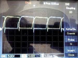 Po zmontowaniu całego zasilacz i sprawdzenia poprawności montażu nadeszła pora na wstępne uruchomienie. Do tego celu będzie potrzebna żarówka 60 W/230 V, którą włączamy szeregowo w obwód zasilania zasilacza. Podczas uruchamiania należy zachować szczególną ostrożność, ponieważ część układu jest pod napięciem sieciowym. Najlepiej do tego celu użyć tzw. transformatora bezpieczeństwa. Przy wyjętym bezpieczniku F1 i urządzenia dołączonym do sieci sprawdzamy poprawność napięć wyjściowych. Na kondensatorze C21 powinno występować napięcie ok. +12 V, na doprowadzeniu 1 złącza CON3 napięcie +5 V. Na wyprowadzeniu 2 transformatora sterującego powinno być ok. 7...10 V. Na nóżce14 układu TL494 występuje napięcie referencyjne o wartości +5 V. Na nóżkach 2 i 15 układu TL494 powinno być po ok. 2,5 V. Teraz pozostało nam sprawdzenie występowania impulsów sterujących. Do tego celu będzie potrzebny oscyloskop, najlepiej dwukanałowy. Należy zawrzeć wyprowadzenia 2 i 3 złącza CON3. Przebiegi najpierw sprawdzamy na nóżkach 8 i 11 układu TL494 - powinny wyglądać jak pokazano na fotografii 6.