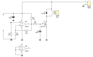 Schemat układu sterownika wentylatora chłodzącego pokazano na rysunku 7. Jako czujnik temperatury zastosowano układ LM35 z wyjściem analogowym. Jego napięcie wyjściowe jest wzmacniane poprzez wzmacniacz nieodwracający U2A, którego wzmocnienie ustalono na 5,14.