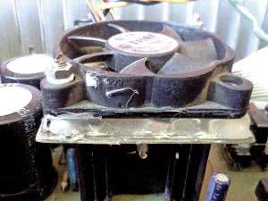 Przekładnik prądowy jest wykonany na rdzeniu toroidalnym o średnicy 25 mm i grubości 3 mm. Najpierw trzeba nawinąć uzwojenie wtórne składające się z 30 zwojów DNE 0,25 mm. Uzwojenie pierwotne składa się z jednego zwoju nawiniętego trzema równoległymi drutami DNE 0,4 mm i dodatkowo jest naciągnięta na nie sterująizolacja. Wygląd wmontowanego przekładnika pokazano na fotografii 5.