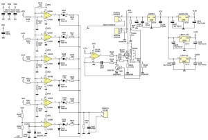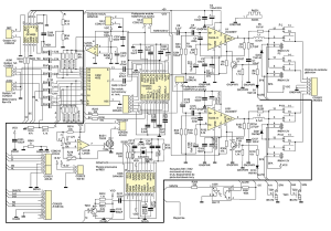 Moduł radia FM jest zasilany napięciem +5 V pochodzącym z układu opisywanego wcześniej. Na wyprowadzeniach 8 i 7 są dostępne analogowe sygnały audio, które po podzieleniu na dzielnikach R13/R14 i R113/R114 są podawane na wejścia przełącznika audio. Jako dekodera sygnału RDS użyto układu typu SAA6588 pracuje on z kwarcem 8,664 MHz. Układ jest zasilany tym samym napięciem, co moduł FM, procesor dźwięku i przełącznik wejść. Sygnał DAVN jest wyprowadzony do złącza CON214 połączone jest ono z panelem czołowym. Ostatnim elementem płyty głównej jest układ chłodzenia radiatora wzmacniaczy mocy z komparatorem U203B. Działanie tego układu jest też oczywiste, więc nie będzie tu opisywane.