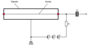 Katoda znajduje się zwykle na potencjale masy, wysokie napięcie dodatnie podawane jest na anodę przez rezystor roboczy R. Nie jest to jednak zasadą i zdarzają się inne schematy polaryzacji tuby, tak jak chociażby w przypadku opisywanego układu. W takim klasycznym przykładzie z rysunku 1 impulsy generowane w układzie, w postaci spadku napięcia na anodzie, są ujemne względem wysokiego napięcia zasilającego licznik, a kondensator C stanowi tutaj separację między wysokim napięciem zasilania, a układami przedwzmacniacza, zasilanymi zwykle z niskiego napięcia.