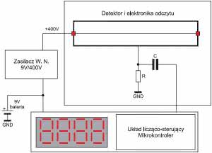 Przetwornica generuje napięcie 400 V niezależnie od mikrokontrolera, przez co tuba licznikowa zasilana jest cały czas po włączeniu urządzenia. Wygenerowane w tubie impulsy, po wstępnym wzmocnieniu, trafiają do układu liczącego poprzez izolację optyczną. Na podstawie zliczonych impulsów i czasu, w którym to nastąpiło mikrokontroler wylicza żądane wielkości fizyczne i prezentuje je na wyświetlaczu LED.