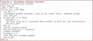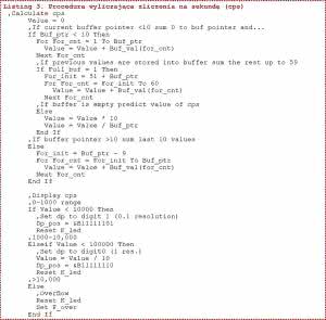 Na samym początku zerowana jest zmienna przechowująca wyliczoną wartość (Value). Tablica Buf_val(x) przechowuje zmierzone wartości natomiast wskaźnik bufora Buf_ptr wskazuje na najnowszy wynik z pomiaru. Do uśredniania zawsze brane jest 10 ostatnich wyników. Jeśli wartość wskaźnika jest większa lub równa 10 pętla For sumuje 10 ostatnich wyników i jest to gotowa wartość cps pomnożona przez 10.