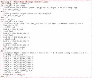 Licznikiem multipleksera jest tutaj zmienna Led_ptr, której wartość jest zwiększana cyklicznie po każdym wykonaniu tego fragmentu kodu. Dla wartości 0-3 na wyświetlaczu pokazywane są cyfry, natomiast dla wartości Led_ptr = 4 zaświecają się diody kontrolne. Zaraz po wejściu do obsługi wyświetlania sprawdzany jest stan Led_ptr i gaszona jest aktywna wcześniej anoda wyświetlacza. Potem zwiększana jest wartość Led_ptr i w zależności od niej katody wyświetlacza (lub diody) przyjmują odpowiednie wartości. Tablica Led_dig(x) przechowuje aktualne wartości, jakie powinny być wyświetlone na poszczególnych pozycjach wyświetlacza.