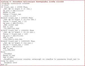 Procedura na pierwszy rzut oka jest skomplikowana, jest to wynikiem automatycznej zmiany zakresów, którą chciano uzyskać. Gdy ilość zliczeń jest mniejsza niż 10000 to dioda ×1000 nie jest zapalana a na wyświetlaczu prezentowana jest bezpośrednio ilość zliczeń. Gdy wartość w zmiennej Count_val przekroczy 10000 to dioda ×1000 zostaje włączona a wyświetlacz prezentuje wynik w kilo zliczeniach czyli w tysiącach zliczeń. W zależności od wartości precyzja wskazań to 0.01 k, 0.1 k lub 1 k zliczeń. W efekcie układ może mierzyć do 1000000 impulsów a po przekroczeniu tej liczby zgłaszany jest błąd i układ się zatrzymuje.