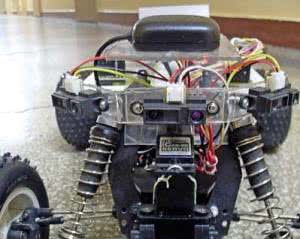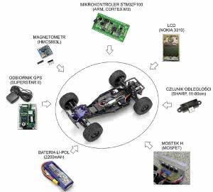 Wszystkie czujniki, bateria, sterownik i elektronika sterująca znajduje się na podwoziu pojazdu, co schematycznie pokazano na rysunku 1.