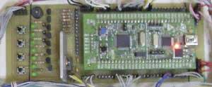 Płytka STM32DISCOVERY została osadzona w zaprojektowanej i wykonanej przeze mnie płytce bazowej, rozszerzającej liczbę wyprowadzeń związanych z zasilaniem (do zasilania wielu czujników). Na płytce rozszerzającej znajduje się również liniowy stabilizator napięcia, prosta klawiatura 4-przyciskowa, 7 diod LED oraz brzęczyk.