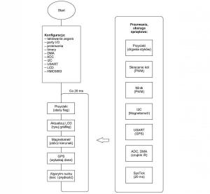 Program sterujący napisałem w języku C, zgodnie z algorytmem pokazanym schematycznie na rysunku 3. Konfiguracja układów peryferyjnych mikrokontrolera jest zrealizowana poprzez bezpośrednie zmiany wartości odpowiednich rejestrów przypisanych do danego układu peryferyjnego, nie stosowałem biblioteki dostarczonej przez firmę STMicroelectronics.