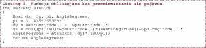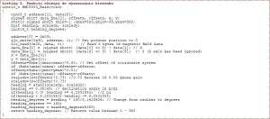 Takie założenie nie wprowadzi znaczących błędów a pozwoli zredukować ilość wykonywanych przez mikrokontroler obliczeń. Funkcję obliczającą kąt, pod którym powinien podążać zamieszczono na listingu 1. Funkcje GpsLatitude() oraz GpsLongitude() zwracają aktualne położenie, natomiast DestLongitude() oraz DestLatitude() zwracają współrzędne geograficzne punktu docelowego. Wynikiem jest zmienna całkowita wyrażona w stopniach, której wartość mieści się w przedziale (0, 360).