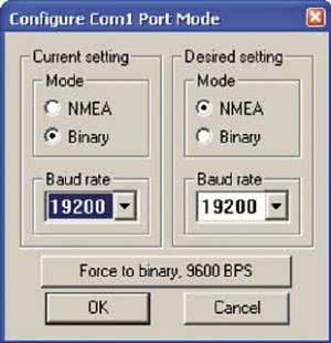Aby zmienić metodę wysyłania danych przez odbiornik GPS, wystarczy wywołać odpowiednią pozycję z menu programu, w tym wypadku Configure COM1 Port Mode. Po wcześniejszym połączeniu odbiornika z komputerem, po zaakceptowaniu zmiany ustawień, aplikacja wyśle do odbiornika odpowiednią komendę odpowiedzialną za ustawienie konfiguracji.
