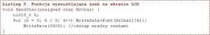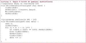 Komunikację rozpoczyna się od ustawienia linii /SCE w stan niski, co aktywuje interfejs SPI. Jeśli wysyłany bajt jest komendą, linię D/C ustawia się w stan niski, a jeśli zwykłą daną - w stan wysoki. Następnie, linią SDIN, szeregowo (bit po bicie) przesyła się 8 bitów danej, zaczynając od bitu najbardziej znaczącego. Transmisja szeregowa jednego bitu przebiega w następujący sposób: najpierw zeruje się lub ustawia, zależnie od wartości przesyłanego bitu, linię danych SDIN. Następnie, na linii SCLK podaje się impuls: 0-1-0. Zmiana na linii /SCE poziomu niskiego na wysoki sygnalizuje zakończenie transmisji [3]. Funkcja zamieszczona na listingu 3 realizuje wysłanie 1-bajtowej liczby do pamięci wyświetlacza.