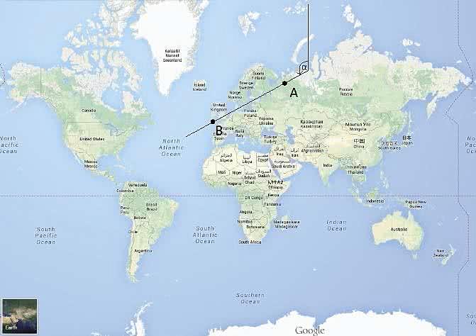 Rysunek 7. Punkt aktualny (A) oraz punkt docelowy (B) tworzą prostą o pewnym kącie nachylenia (a) względem południka
