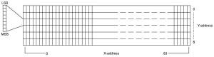 Wbudowana w sterownik pamięć RAM jest zapisywana po ustawieniu linii D/C. Matryca wyświetlacza może wyświetlić 48 linii. Każda linia ma 84 piksele. Pamięć jest zorganizowana w 6 banków po 84 bajty każdy (rysunek 9). Taka organizacja wymusza logiczny podział pola wyświetlacza na 6 wierszy po 84 kolumny. Wiersze są numerowane 0...5, a kolumny 0...83.