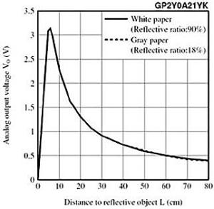 Otrzymane napięcia dla każdej z odległości umieściłem w programie w postaci tablicy danych. Napięcie odczytane z przetwornika A/C jest porównywane z danymi zawartymi w tablicy. Gdy wartość odczytanego napięcia zawiera się w przedziale dwóch sąsiednich komórek tablicy, pobierana jest odpowiadająca tym komórkom odległość i zwracana przez funkcję zawierającą opisany algorytm. W wyniku działania funkcji otrzymujemy wartości odległości z dokładnością 10 cm.