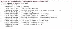 Najwyżej położony piksel w pasku odpowiada najmniej znaczącemu bitowi, a najniżej - najbardziej znaczącemu. W standardowym trybie wyświetlania, ustawienie bitu w bajcie pamięci odpowiada zaświeceniu, a wyzerowanie zgaszeniu piksela [4]. Sterownik PCD8544 należy odpowiednio skonfigurować, ustawiając współczynnik kompensacji temperaturowej, napięcie wewnętrznej przetwornicy (Vop) oraz inne. Na listingu 5 zamieszczono listę komend poprawnie inicjalizujących wyświetlacz.