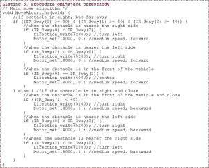 Gdy czujniki odległości rozpoznają przeszkodę w pobliżu, algorytm zbliżania się do punktu pośredniego lub docelowego jest przerywany i sterowanie przejmuję funkcja odpowiedzialna na ominięcie przeszkody. Algorytm omijania przeszkód ma za zadanie tak wysterować układ kierowniczy i napędowy pojazdu, aby ten bezpiecznie oddalił się od wykrytej przeszkody. Na listingu 6 zamieszczono kod funkcji odpowiedzialnej za zmianę zachowania pojazdu w zależności od miejsca przeszkody względem robota.