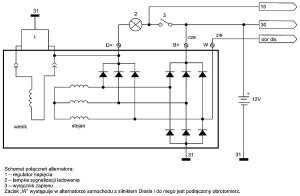 Źródłem impulsów potrzebnych do odczytu prędkości obrotowej silnika jest alternator. Na rysunku 1 pokazano schemat typowego alternatora z wyjściem dla obrotomierza oznaczone literą "W". Występuje tam przebieg zbliżony do prostokątnego o częstotliwości zależnej od obrotów. Jeśli mamy alternator bez tego wyjścia, musimy je dorobić we własnym zakresie, co nie powinno sprawić problemów.