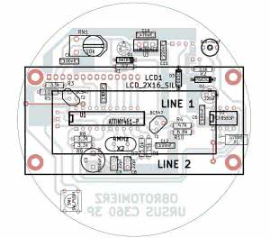 Schemat montażowy pokazano na rysunku 4. Obrotomierz jest zmontowany na okrągłej płytce jednostronnej o średnicy 85 mm. Wszystkie złącza są montowane od spodniej strony płytki (fotografia 5). Kondensator C3 musi być zamontowany w pozycji leżącej, aby zmieścił się pod wyświetlaczem. Mikrokontroler U1 montujemy na końcu po uprzednim zaprogramowaniu go. Podczas programowania należy ustawić fusebity.