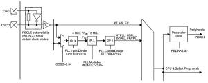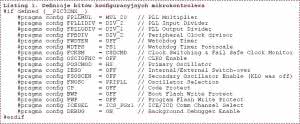Źródłem zegara taktującego mikrokontroler jest oscylator kwarcowy o częstotliwości 8 MHz stabilizowany kwarcem X1. Sygnał z oscylatora jest podawany na wejście układu PLL, w którym najpierw jego częstotliwość jest dzielona przez 2 w module divx, a potem powielana przez 20 w module PLL (rysunek 2). Układ taktowania jest programowany za pomocą bitów konfiguracyjnych mikrokontrolera. Na listingu 1 pokazano definicje wszystkich bitów konfiguracyjnych mikrokontrolera.