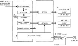 Moduł RTTC (rysunek 3) jest dość rozbudowanym modułem zawierającym liczniki czasu (godziny, minuty, sekundy) liczące w formacie 24 godzinnym, liczniki kalendarza (dzień tygodnia, dzień miesiąca, miesiąc i rok), konfigurowane alarmy, oraz programowana kalibrację dokładności odmierzania czasu.