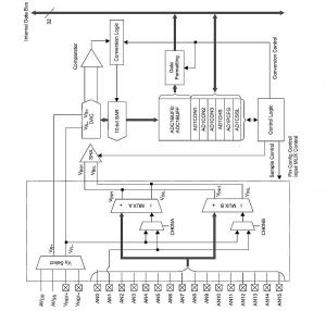 Zasadniczym blokiem funkcjonalnym używanym w woltomierzu jest wbudowany w strukturę przetwornik A/C o rozdzielczości 10 bitów, wykonujący konwersje SAR (Successive Approximation Register). Na wejściu przetwornika umieszczono 16-wejściowy multiplekser analogowy. Napięciem referencyjne może być napięcie zasilające mikrokontroler lub napięcie zewnętrzne, podawane na odpowiednie wejścia analogowe.