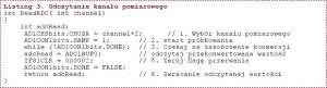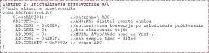 Tak rozbudowany moduł peryferyjny, którym jest przetwornik A/C wymaga wstępnej inicjalizacji. Ja założyłem, że wejścia analogowe nie będą automatycznie skanowane, a o tym, na którym wejściu aktualnie będzie wykonywany pomiar będzie decydował program użytkownika. Po zakończeniu próbkowani moduł ma wykonać automatyczna konwersję na postać cyfrową. W czasie testowania miernika używałem jako napięcia referencyjnego napięcia zasilania mikrokontrolera o wartości +3,3 V. Na końcu inicjalizacji moduł przetwornika jest włączany. Procedurę inicjalizacji pokazano na listingu 2.