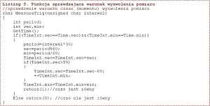 Odmierzany czas z modułu RTCC jest odczytywany przez funkcje biblioteczną GetTime. Odczytane wartości są zapisywane do struktury Time. Moment wyzwolenia pomiaru jest określany przez funkcję MeasureTrig (interwal) pokazaną na listingu 5. Po odczytaniu czasu z RTCC jest on porównywany z czasem zapisanym w strukturze TimeInt.