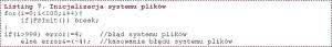 Detekcja włożenia karty w gniazdo jest wykonywana poprzez sprawdzanie poziomu logicznego na wejściu SD_CD (Card Detect). Jeżeli SD_CD ma poziom niski, to oznacza, że karta jest włożona w złącze. Takie sprawdzanie jest wykonywane przez każdym zainicjowaniem systemu plików i jeżeli program wykryje brak karty, to jest generowany odpowiedni komunikat o błędzie i pomiar nie będzie mógł być wykonany. Inicjowanie systemu plików jest wykonywane przez funkcję biblioteczną FSInit. Program próbuje to robić 100 razy w pętli. Jeżeli w trakcie tych prób FSInit zawsze zwróci zero, to zostanie zgłoszony błąd systemu plików i pomiar nie zostanie wykonany (listing 7).