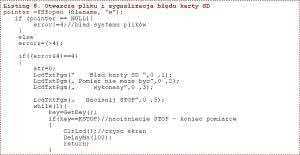 Jeżeli tak, to poprzedni plik jest niszczony i w jego miejsce jest tworzony nowy plik. W obecnej wersji program nie sprawdza czy w katalogu głównym jest plik o takiej samej nazwie i nie wysyła ostrzeżenia o zniszczeniu poprzedniego pliku. Jeżeli poprzedni plik jest potrzebny, to trzeba go przekopiować na inny nośnik lub do jakiegoś podkatalogu. Prawidłowo otwarty plik zwraca wskaźnik na strukturę pliku FSFILE. Jeżeli zostanie zwrócona wartość zerowa, to oznacza to niepowodzenie otwarcia pliku i w tym przypadku pomiar i jego rejestracja nie będą mogły zostać wykonane (listing 8).