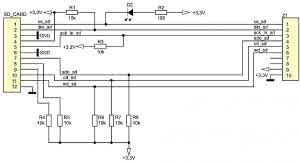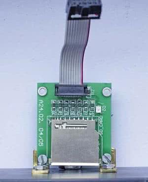 Złącze karty SD oraz kilka dodatkowych elementów (rezystory podciągające i dioda LED) zostały umieszczone na osobnej płytce (rysunek 7). Płytka jest połączona z płytka sterownika za pomocą złącz IDC10 zaciskanych na taśmie przewodów. Pozwala to na większą elastyczność w umieszczaniu złącza w obudowie.