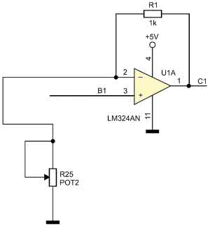 Powstaje w ten sposób klasyczny wzmacniacz nieodwracający o wzmocnieniu równym G=1+R1/R25 (rysunek 12). Ponieważ w takim przypadku napięcie wejściowe jest podawane bezpośrednio na wejście wzmacniacza operacyjnego trzeba zadbać o dodatkowe zabezpieczenia przez przepięciami, lub mieć pewność, że napięcie mierzone nie będzie wyższe niż napięcie zasilania.
