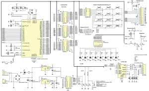 Schemat ideowy Panelu pokazano na rysunku 1. Głównym elementem jest mikrokontroler STM32F103. Wszystkie dostępne porty zostały wyprowadzone na gniazda szpilkowe J6...J8. Gwiazdka przy nazwie portu oznacza, że port może współpracować z układami zasilanymi +5 V. Pogrubienie nazwy portu oznacza, że należy ostrożnie korzystać z takiego wyprowadzenia, bo może być podłączone do układów zamontowanych na Panelu. Układy te służą do testowania możliwości mikrokontrolera. Są to: