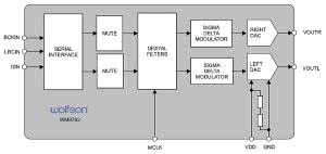 Karta oparta jest o niedrogi i łatwy w aplikacji przetwornik C/A typu WM8762 firmy Wolfson gwarantujący osiągniecie dobrych parametrów przetwarzania niewielkim nakładem środków. Schemat blokowy układu WM8762 pokazano na rysunku 1. Układ zapewnia przetwarzanie sygnału z rozdzielczością 24 bitów przy częstotliwości próbkowania 192 kHz i większym od 90 dB odstępie sygnału od zakłóceń. Schemat modułu wyjść analogowych z układem WM8762 zaprezentowano na rysunku 2.
